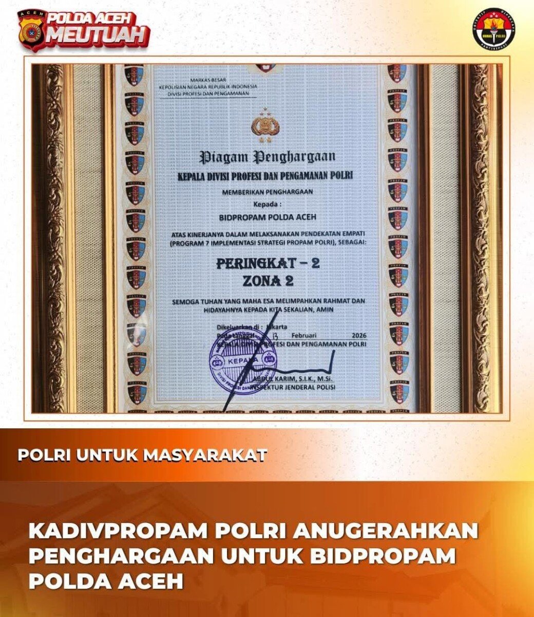 “Polda Aceh berhasil meraih beberapa peringkat unggul di Zona 2 atas dedikasi dalam menjalankan berbagai program strategis yang dicanangkan oleh Divpropam Polri,” ujar Kombes Pol. Joko dalam keterangan resminya, Sabtu (14/2/2026).