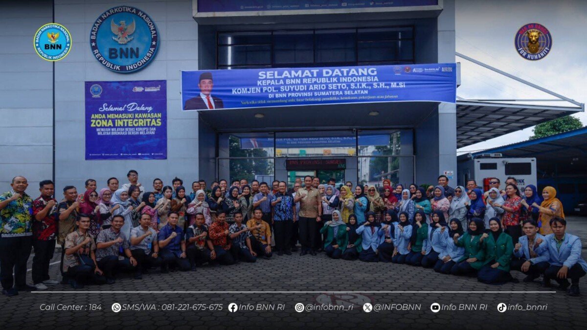 Kunjungan ini bertujuan untuk memperkuat soliditas organisasi serta menyelaraskan langkah strategis dalam pelaksanaan tugas di lapangan. Kehadiran Kepala BNN RI Komjen Pol. Suyudi disambut langsung oleh Kepala BNNP Sumatera Selatan, Brigjen Pol. Hisar Siallagan, S.I.K., beserta jajaran pimpinan BNN Kabupaten/Kota se-Sumatera Selatan.